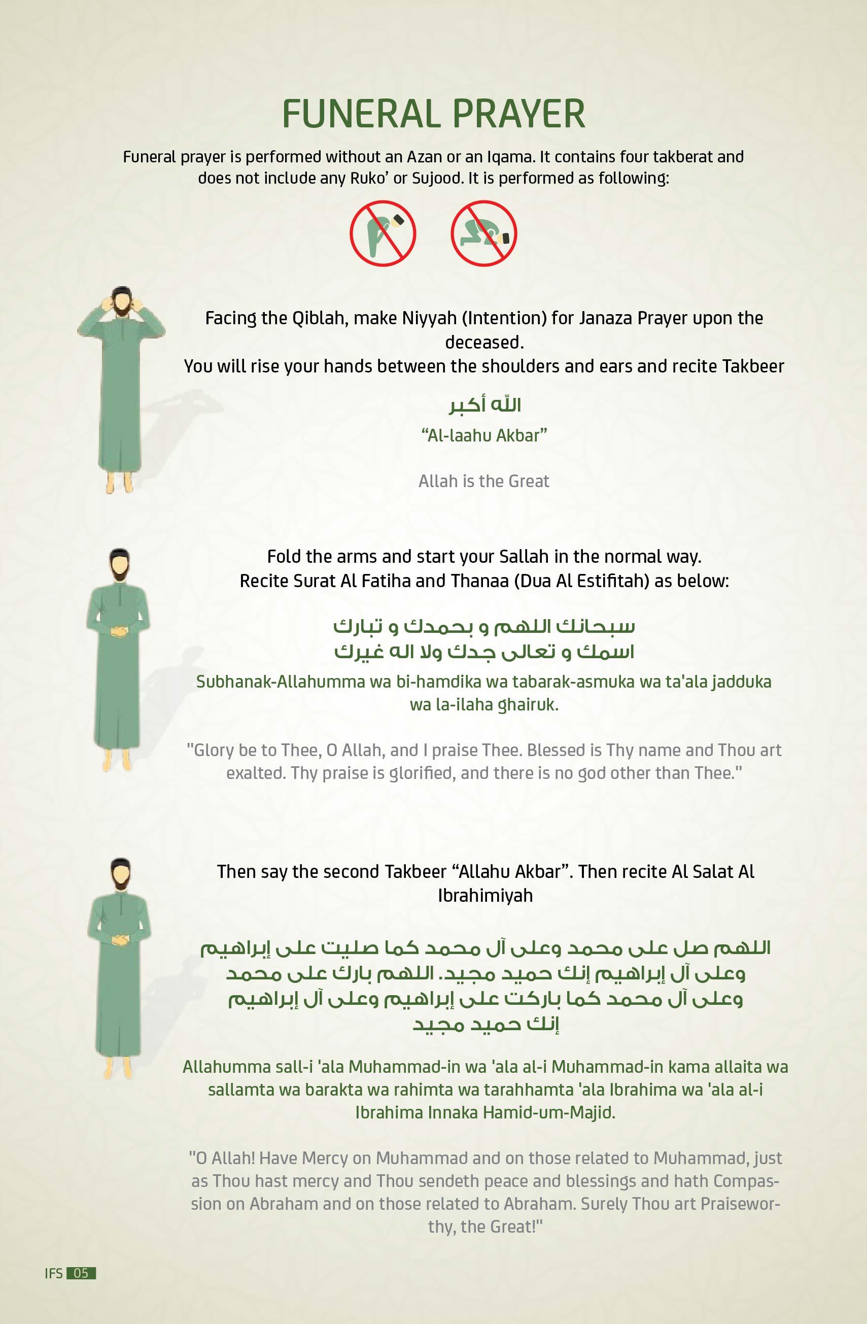 The funeral is usually held in the Mosque’s prayer hall where members of the community gather. The deceased body and all attendees are all turned to face Mecca (Qibla). The funeral prayer is led by the Imam or a family member of the deceased. After prayer, the deceased is taken to the burial site in a silent procession.